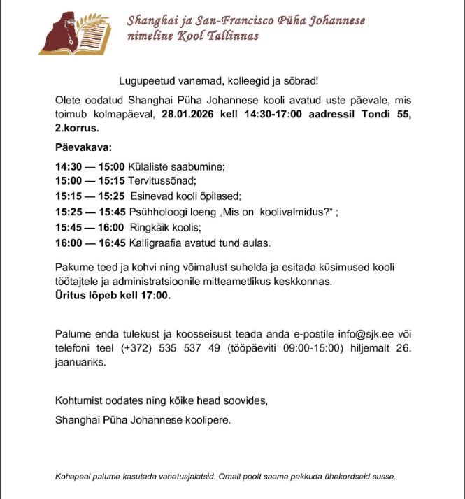 Olete oodatud Shanghai Püha Johannese kooli avatus uste päevale.
