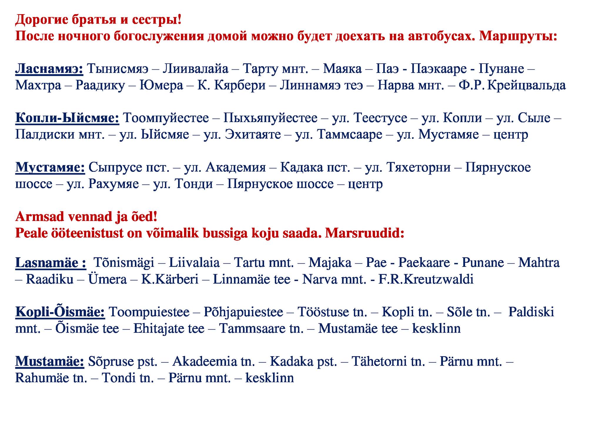 Маршруты автобусов после ночного богослужения